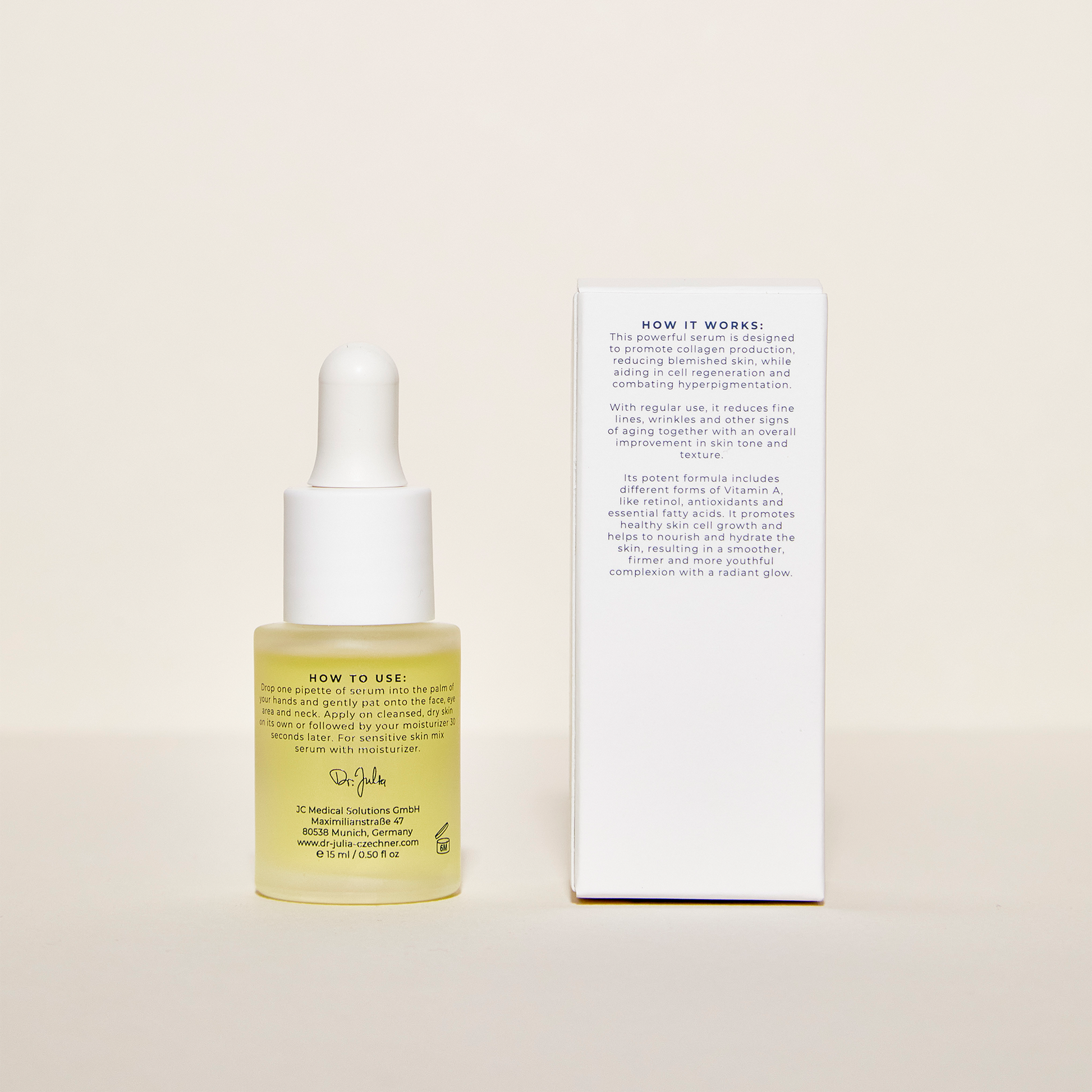 Seine hochwirksame Formel enthält verschiedene Formen von Vitamin A, wie Retinol, Antioxidantien und essentielle Fettsäuren. Es dringt tief in die Haut ein, versorgt sie mit Nährstoffen und Feuchtigkeit, fördert ein gesundes Zellwachstum und führt dadurch zu einem gleichmäßigen, straffen und jüngeren Hautbild.